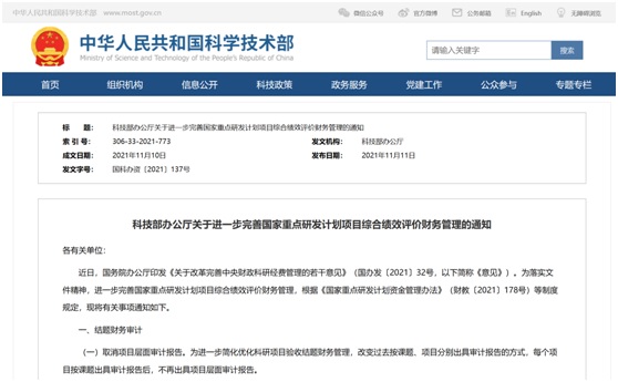 科技部办公厅关于进一步完善国家重点研发计划项目综合绩效评价财务管理的通知-中华人民共和国科学技术部 (most.gov.cn)